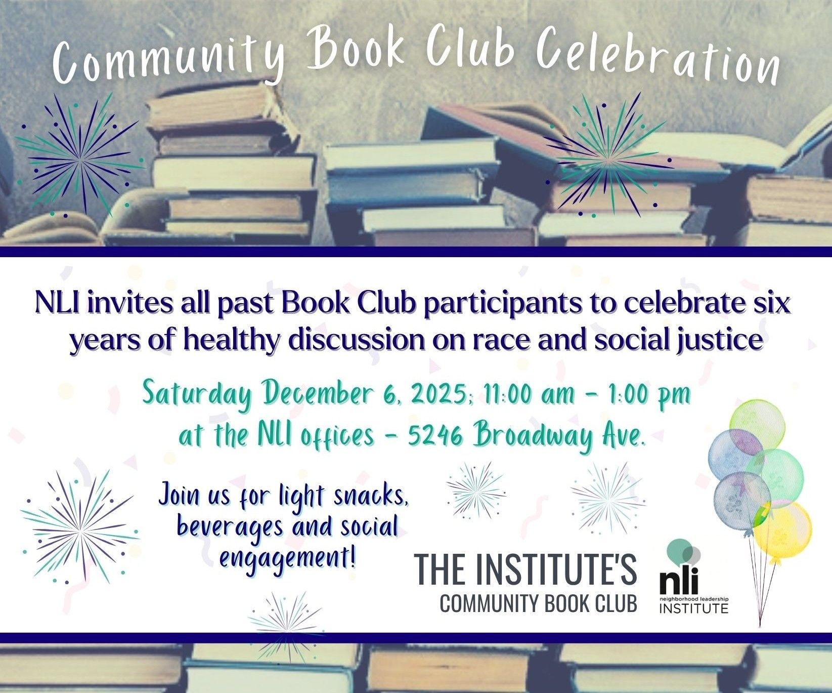 NLI created its Community Book Club in 2020, during the pandemic. For six years, we have convened community members to read and discuss important books covering the topics of race and social justice. More than 700 participants have read 25 books with us. We invite all past members to join us for a celebratory gathering. Past and current Book Club members can RSVP here for the December 6th event.